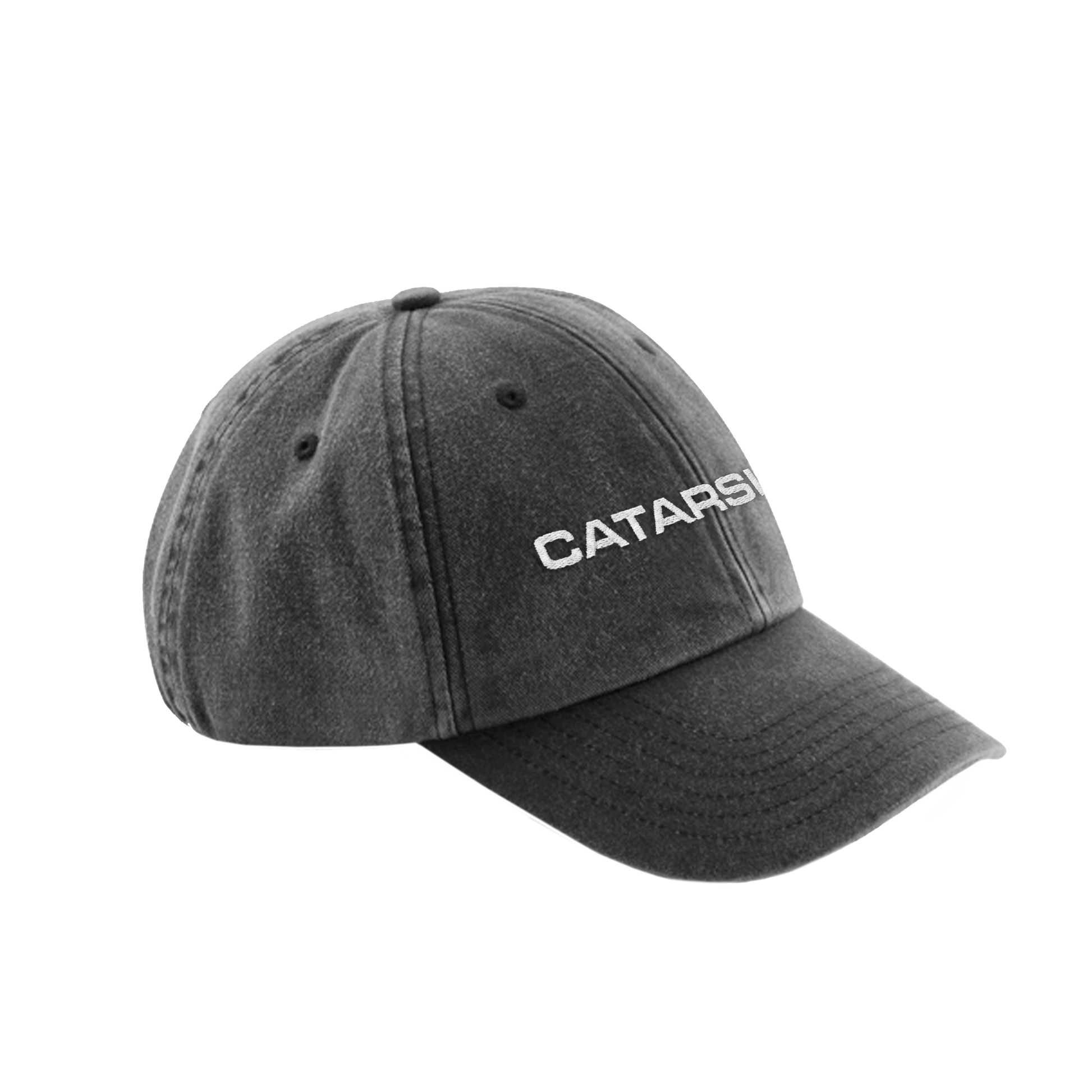 Gorra gris lavado con el título del disco “catarsis”.